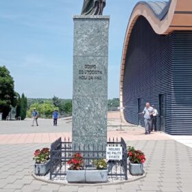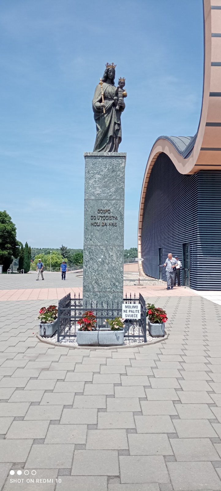 Ispred njega smo se slikali i sve svoje molbe i nakane povjerili Gospi.Dok je po drugi put u povijesti župe velečasni Markić uspio ponovno duhovno i materijalno uzdići župu i svetište gotovo iz ničega i pretvoriti ga u jedno od najposjećenijih Marijanskih svetišta u Hrvatskoj koje godišnje posjeti 100 do 150 tisuća hodočasnika.Nakon zajedničke molitve i našim staračkim, hrapavim glasom otpjevane pučke Marijanske pjesme„Čuj nas Majko, Nado naša“ u novoizgrađenoj crkvi koja ima oblik golubice ili labuda na Dunavu a posvećena je Pohodu Blažene Djevice Marije,rođakinji Elizabeti, uslijedila je okrjepa u klimatiziranoj prostoriji nasuprot nje. Nju su pripremile i poslužile naše vrijedne gerontodomaćice Marija uz pomoć Blaže. Na neizostavni odlazak na Kalvariju ili Križni put, pošli smo nakon ispijene šalice kave. Pomolivši se ispred svake postaje i pogledavši najveći kip Isusa Krista Uskrsnuloga u Republici Hrvatskoj teškog 1600 kg i visokog 5 metara, s postoljem 9. Rad akademskog kipara Bernarda Pešorde, istog onog koji je napravio kip Gospe, ispred crkve. Također smo zavojitim i prašnjavim putem krenuli na Gospinu kapelicu pod lipom, s izvorom žive vode. No tamo su pošli samo oni malo mlađi i pokretniji.