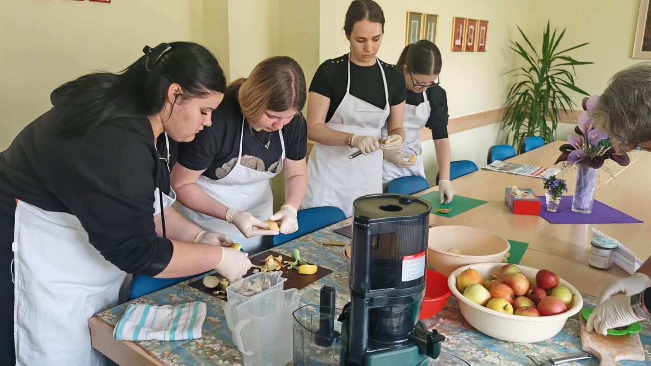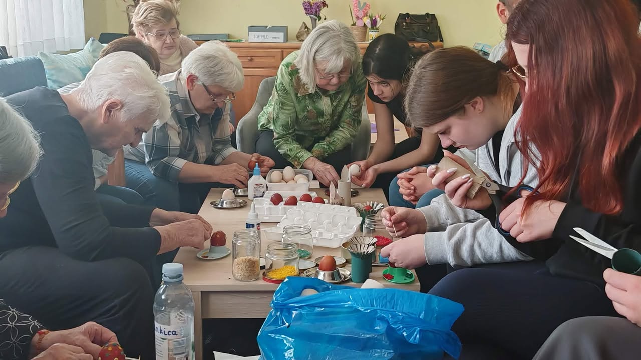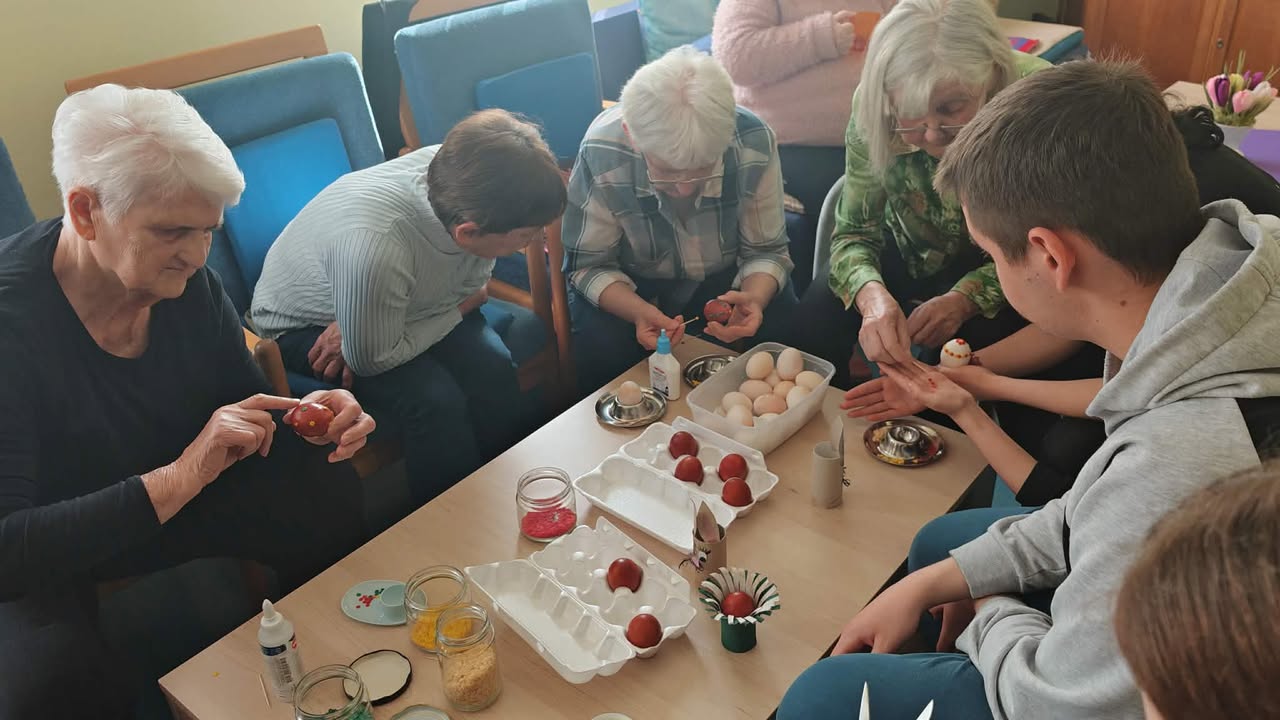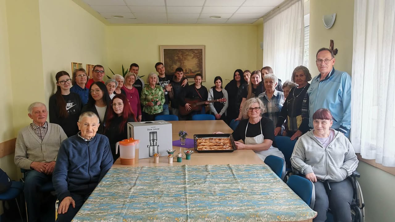 Učenici su s našim korisnicima ukrašavali pisanice, svirali gitaru i pjevali. Osim toga, predstavili su nam sokovnik i sokove kao dio zdrave prehrane. Odrađeno je i predavanje o utjecaju prirodnih sokova na zdravlje ljudi uz degustaciju. Cijeđenje soka od jabuke bez dodataka je bila prava edukacija i za korisnike i za učenike. Od ostataka jabuka, nakon cijeđenja soka, učenici su zajedno s korisnicima napravili vrlo ukusnu „švapsku pitu“. Domaće jabuke smo potpuno iskoristili jer ćemo od oguljene ljuske napraviti bioenzim – sredstvo za čišćenje radnih površina, rekli su učenici.  Svrha aktivnosti je povezati učenike s osobama u potrebi glede empatije, humanitarnog djelovanja te razmjene iskustva i ugodnog druženja, a program je proveden u sklopu projekta “Od ploda do soka – puna čaša zdravlja” koji provodi UZ Strossmayer iz Srednje strukovne škole Antuna Horvata Đakovo. Projekt je usmjeren je edukaciju učenika o tradicionalnoj i modernoj proizvodnji soka od voća i povrća, poticanje poduzetničkih ideja koristeći školske i lokalne vrste namirnica te pravljenje različitih vrsta domaćih multivitaminskih sokova.