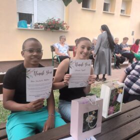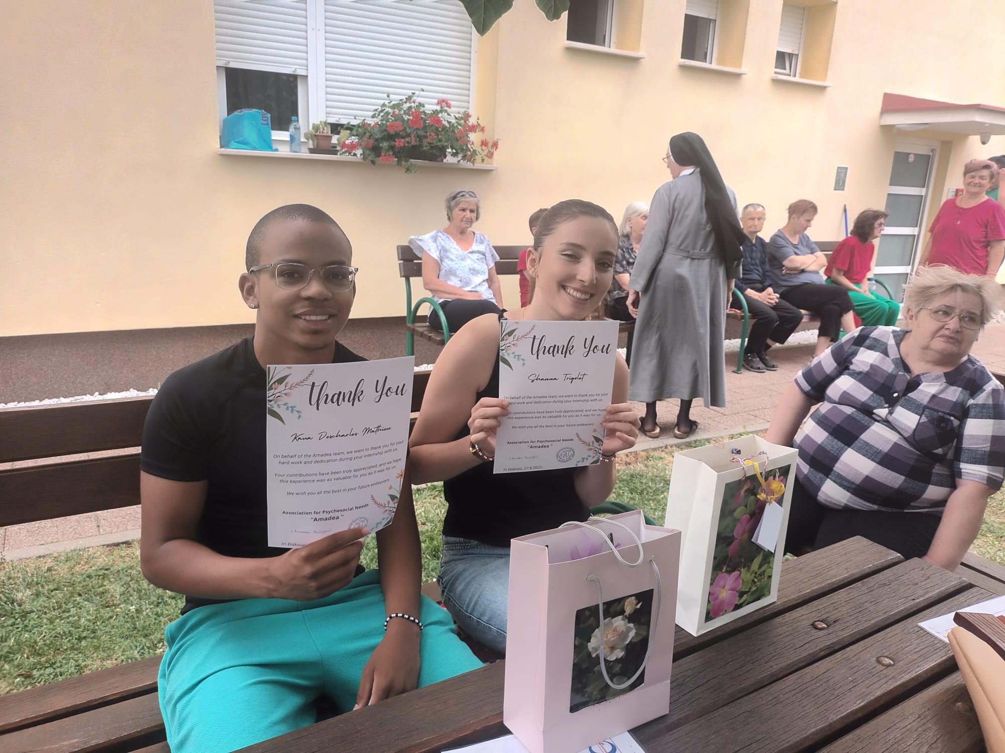 Udruga Amadea imala je čast ugostiti dvoje učenika iz sektora skrbi za starije i nemoćne, kako bi stekli međunarodno iskustvo i upoznali se s tim kako se u našoj lokalnoj zajednici organizira život starijih osoba uključujući i osobe s posebnim potrebama. Proveli su s nama tri tjedna tijekom kojih su sudjelovali u svim svakodnevnim aktivnostima Dnevnog boravka za starije osobe – provodili su vrijeme s korisnicima igrajući (društvene) igre, pripremajući radionice i učeći o načinu života u Hrvatskoj. Naši korisnici naučili su i poneku riječ francuskog, te se upoznali s mjestom iz kojeg naši gosti dolaze. Za vrijeme stručne prakse s korisnicima smo išli i na hodočašće u Dragotin, što im se osobito svidjelo. Posljednji dan proveli smo u druženju i obilasku Samostanske crkve Presvetog Srca Isusova i samostana Milosrdnih sestara sv. Križa.